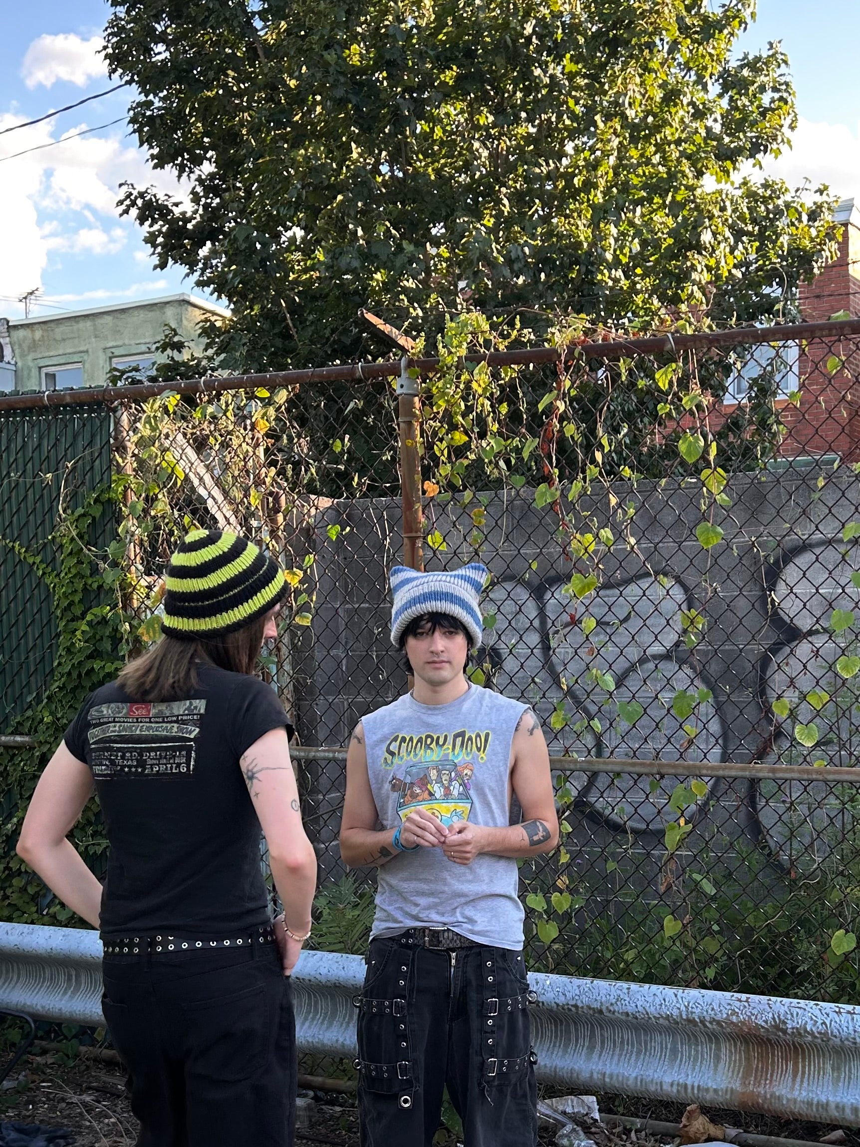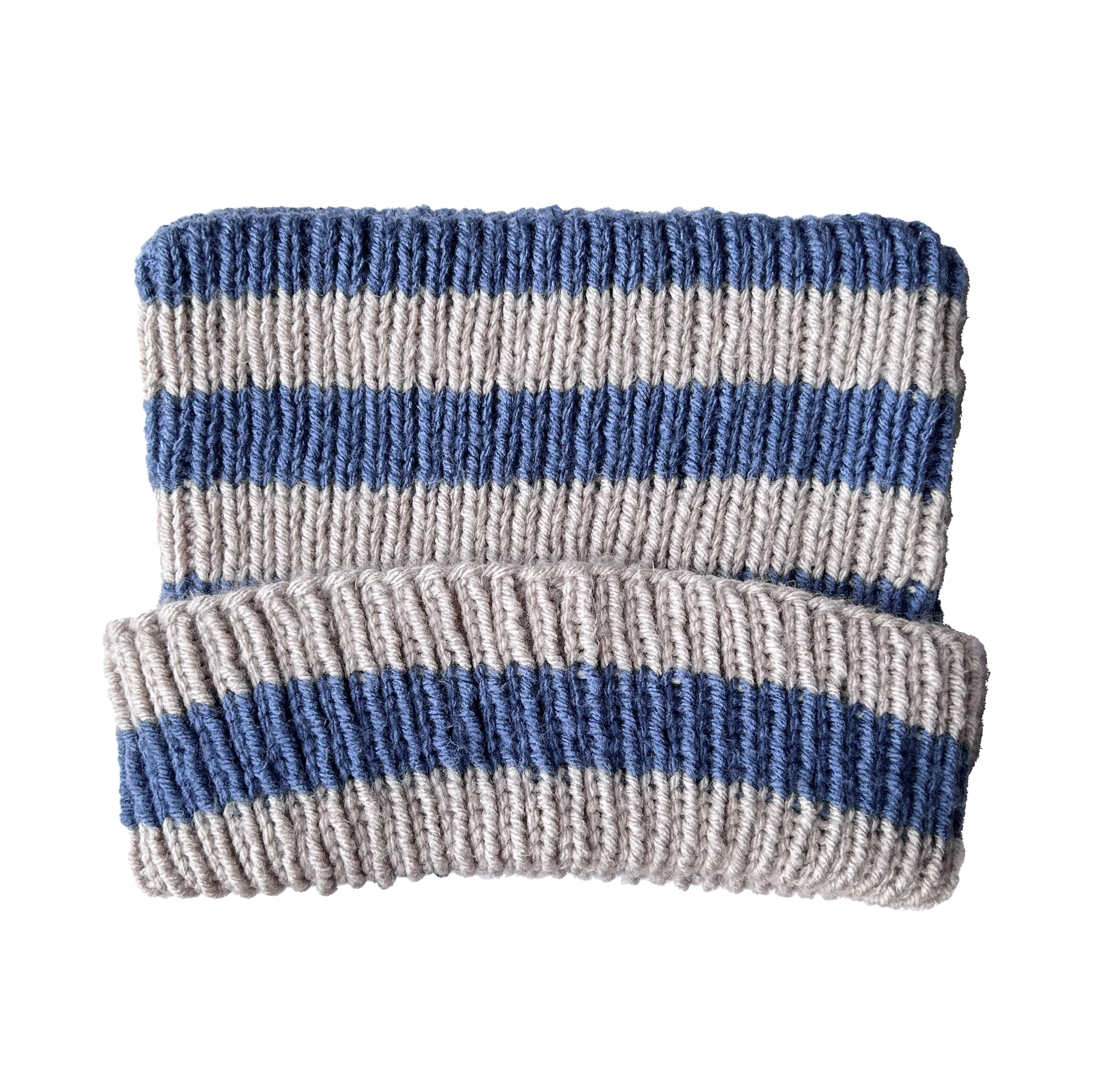 faded blue + grey striped hand knit ear beanie